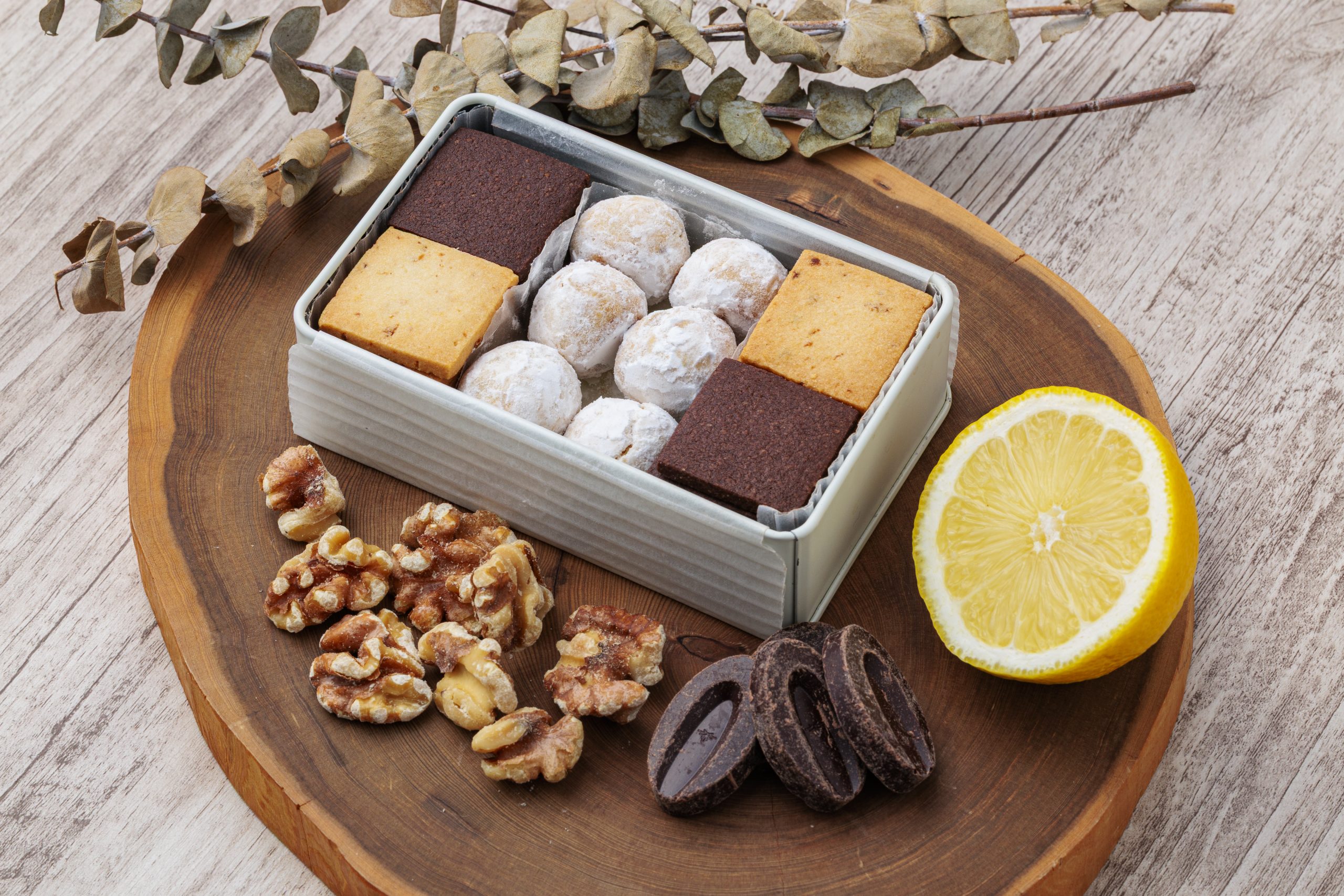 小麦粉不使用、1つの缶で『胡桃と和三盆・ショコラ・レモン』の3種の味をお楽しみいただけます。
