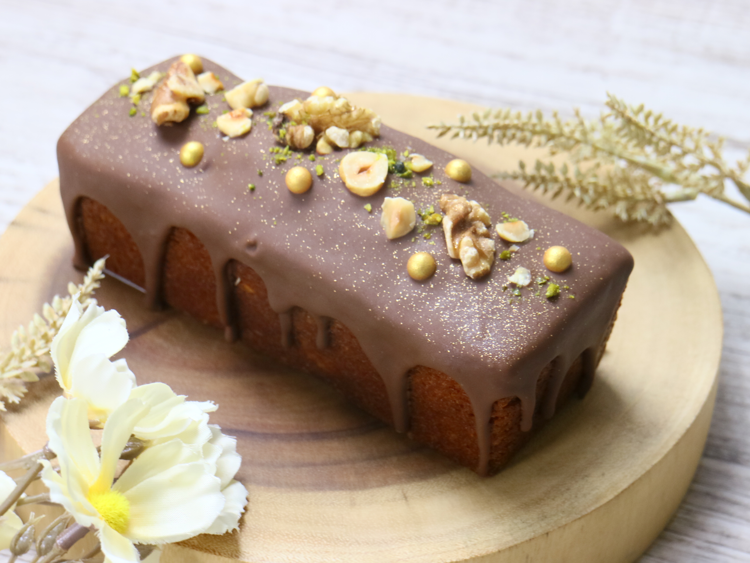 ザクザクの胡桃が入った香ばしいキャラメルパウンドケーキにミルクチョコを合わせました。