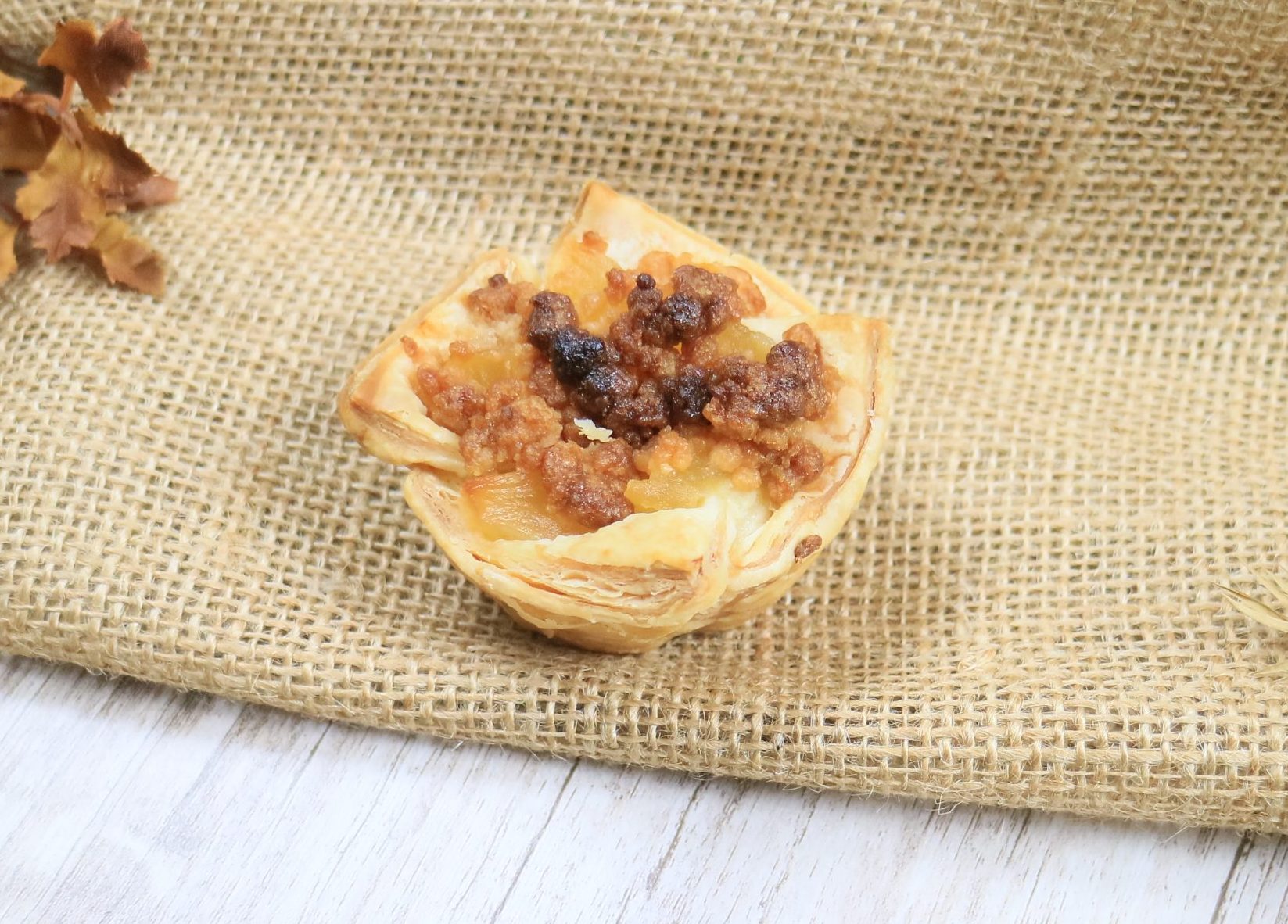サクサクのパイとバニラクリームを合わせた生地にリンゴとシナモン風味のクッキーを乗せました。